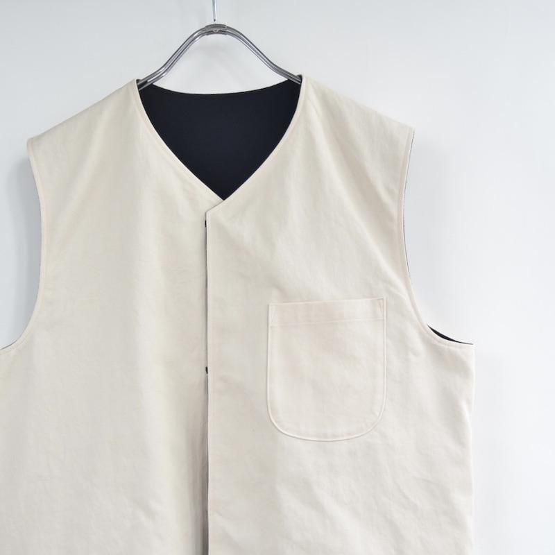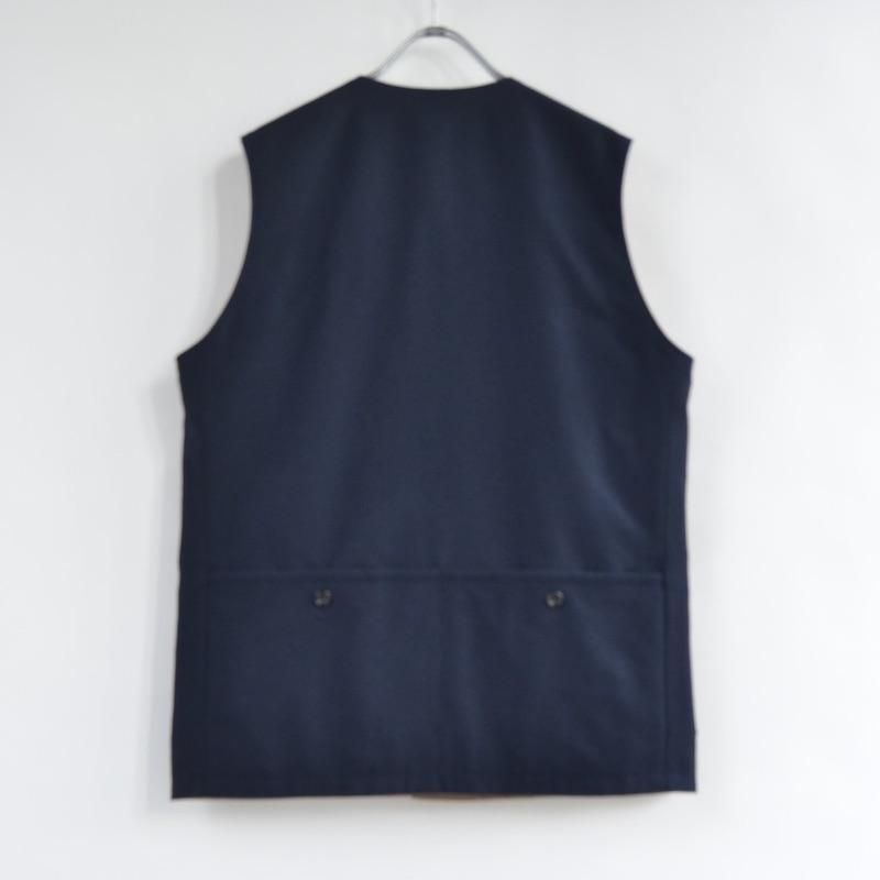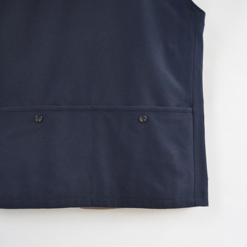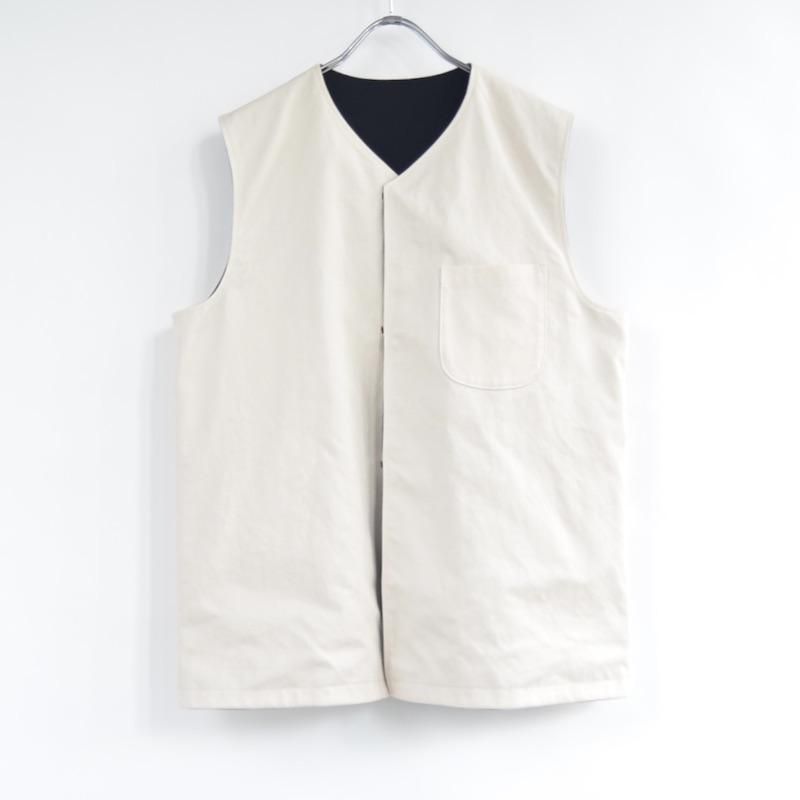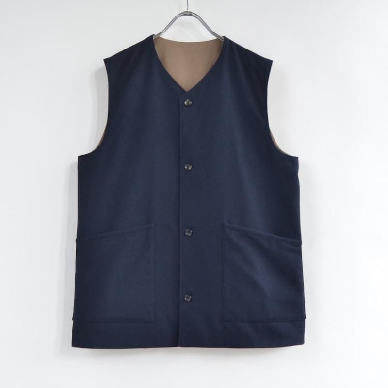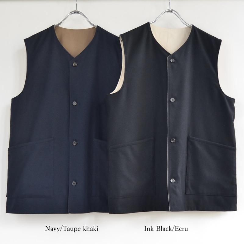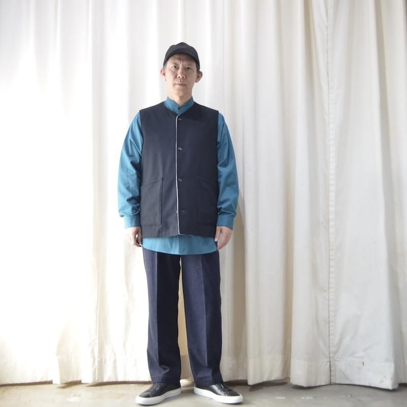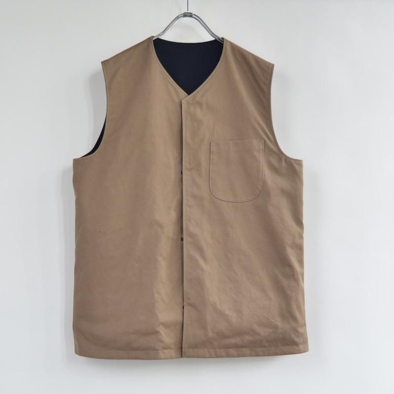 チルトでは初のベスト。リバーシブル仕様のインナーを想定し、過去品番も踏まえどの品番と合わせても綺麗にレイヤリング出来るよう遡って丁寧に寸法組みしています。A 面はセーブル混のコットンブラッシュドシャークスキン、B 面はアルティメイトピマ 100% のシャンブレーラチネを使用。各面全く違った表情でありながらどちらを表にしても至高のオリジナルファブリックを楽しんでいただけます。A 面を表にすればポケットが腰+背面にと大容量なのでシャツやニットの上に着用してアウターを羽織れば殆ど大きなカバンの必要がない程の収納性付与と防風防寒性をコーディネートにもたらしてくれます。