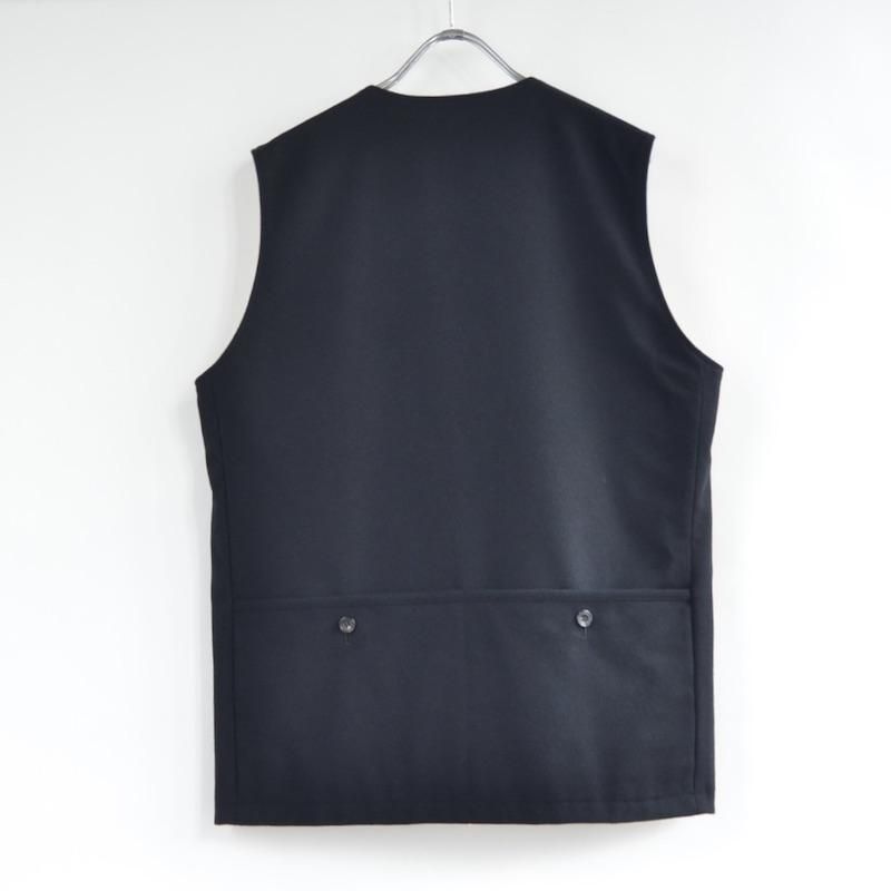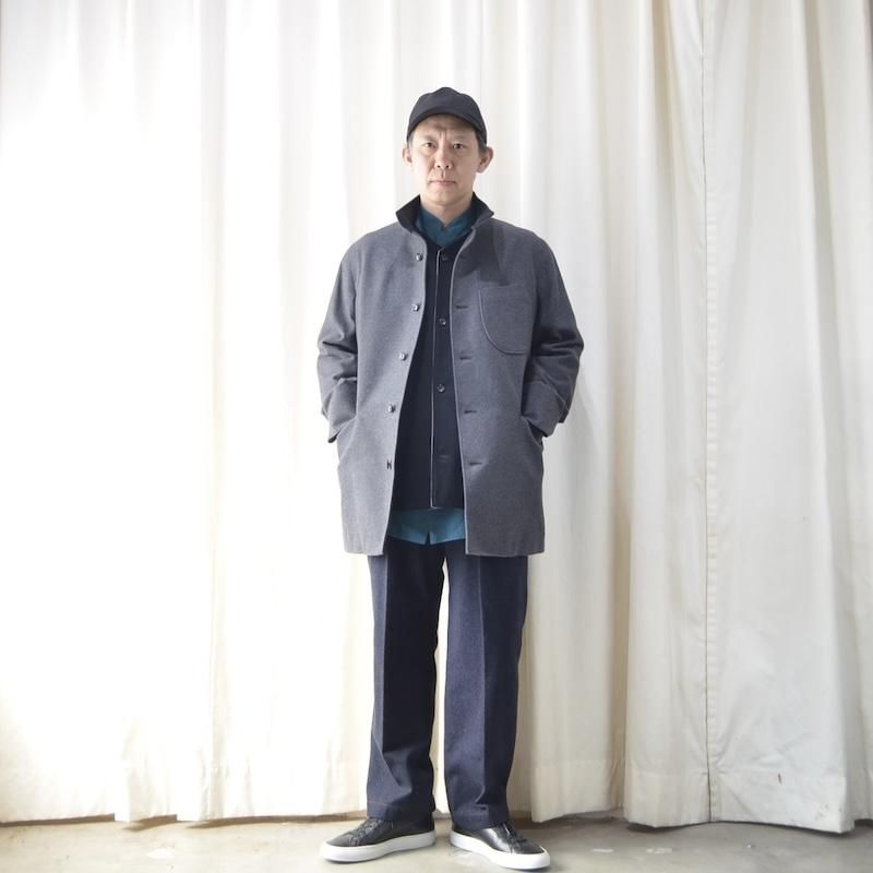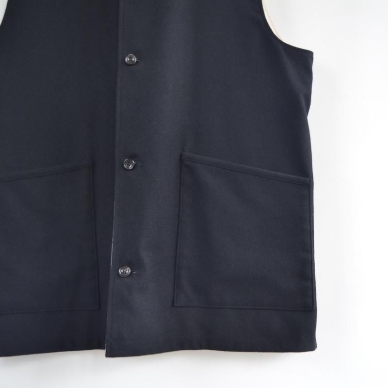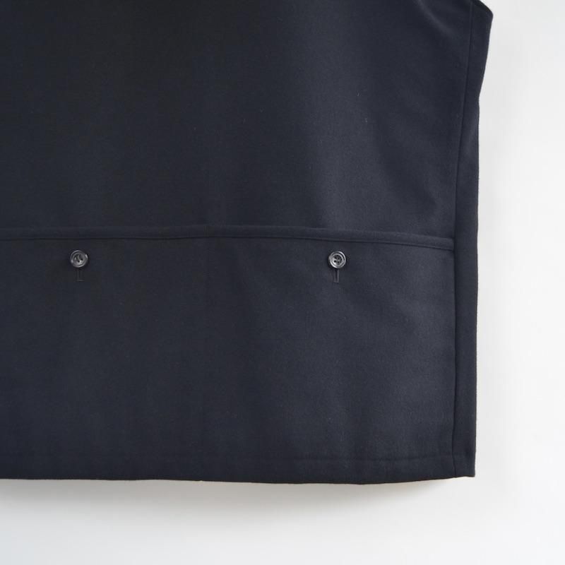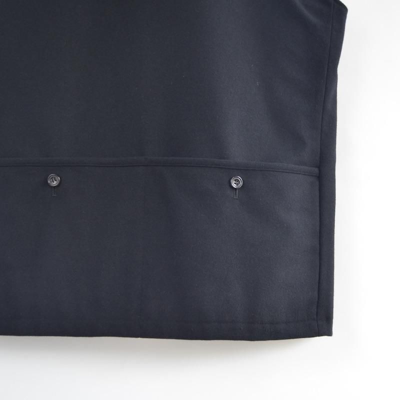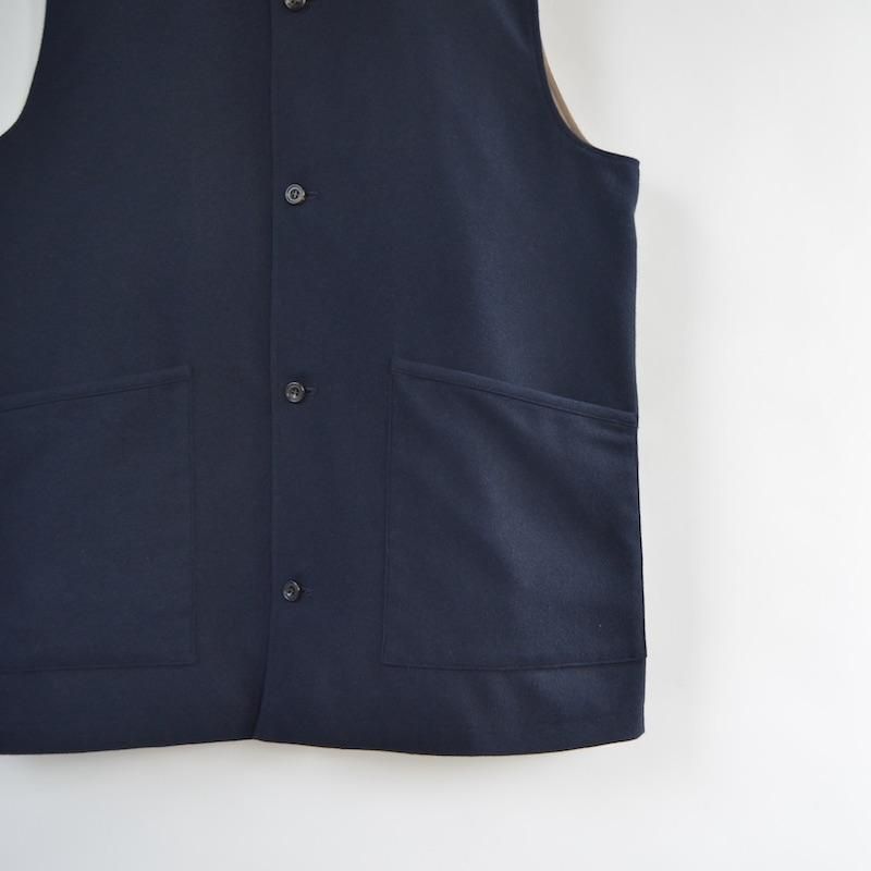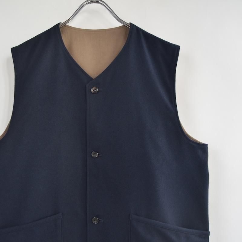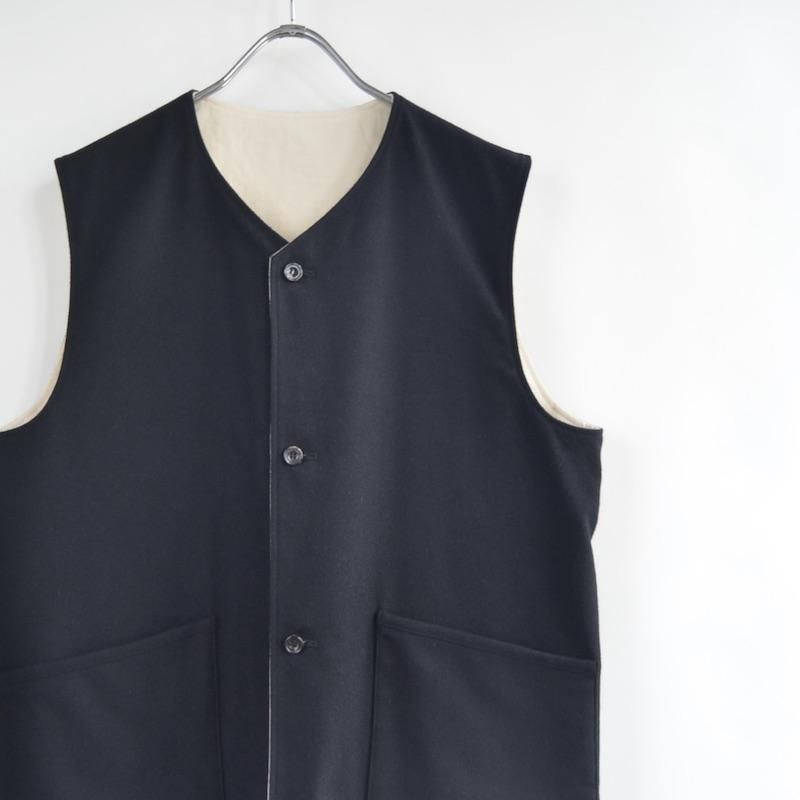 チルトでは初のベスト。リバーシブル仕様のインナーを想定し、過去品番も踏まえどの品番と合わせても綺麗にレイヤリング出来るよう遡って丁寧に寸法組みしています。A 面はセーブル混のコットンブラッシュドシャークスキン、B 面はアルティメイトピマ 100% のシャンブレーラチネを使用。各面全く違った表情でありながらどちらを表にしても至高のオリジナルファブリックを楽しんでいただけます。A 面を表にすればポケットが腰+背面にと大容量なのでシャツやニットの上に着用してアウターを羽織れば殆ど大きなカバンの必要がない程の収納性付与と防風防寒性をコーディネートにもたらしてくれます。