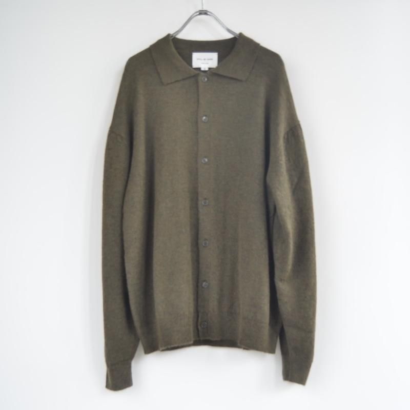エクストラキッドモヘアを表に、裏に防縮ウールを使用して12ゲージで編んだポロ襟のカーディガン。
