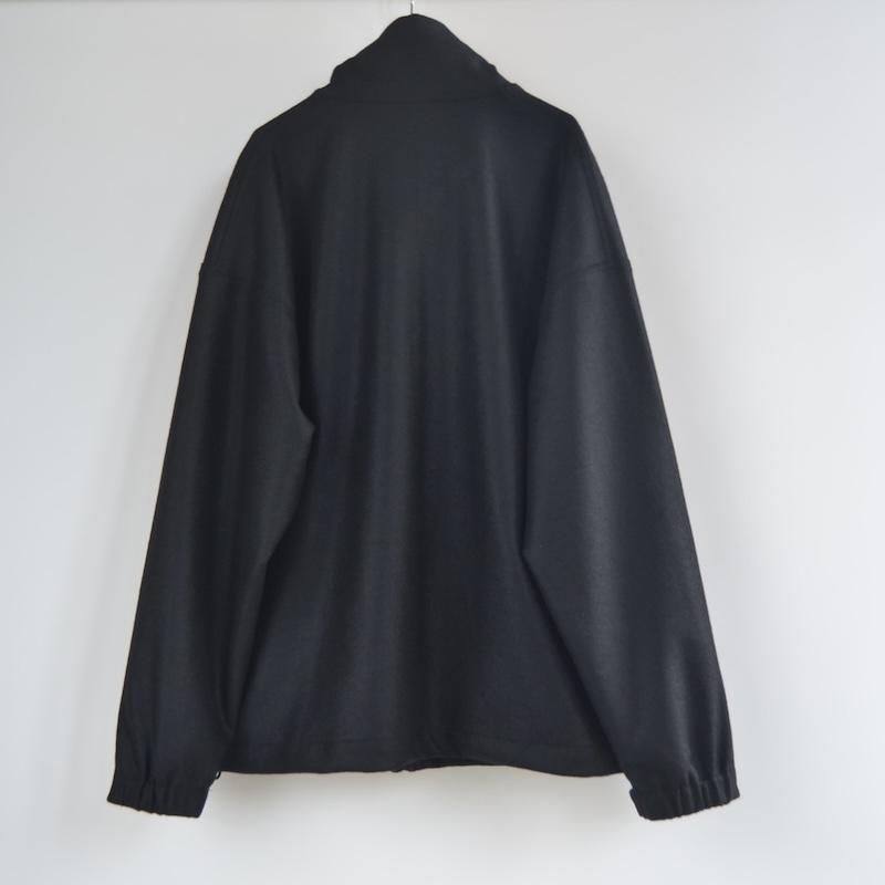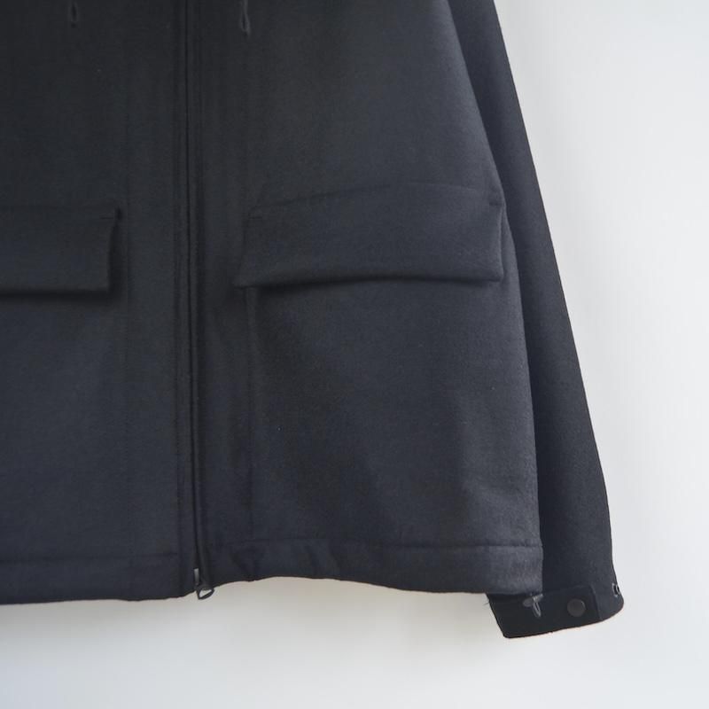 ウールリングヤーンを使用した編地に強力な熱と圧力をかけて加工した素材を使用したスタンドネックジャケットです。リングヤーンは細く強い芯糸に絡み糸を撚り合わせて完成させたリング状の糸で不安定な羊毛を安定させ柔らかな風合いを保つ糸です。この糸で編み立てた素材はウールメルトンのようなハードな風合いと程よい柔らかさ、丸みを帯びた表情を作ります。デザインはBaseballのグラウンドキーパーが着用していたスモッグシャツを参考に雨の侵入を防ぐ襟元のヒモや土埃からポケットを守るフラップといったギミックを残しました。縫製も負荷のかかる肩線やアームホールをダブルステッチで補強。オーバーシルエットでざっくり着れるヒモスタンドネックジャケットです。