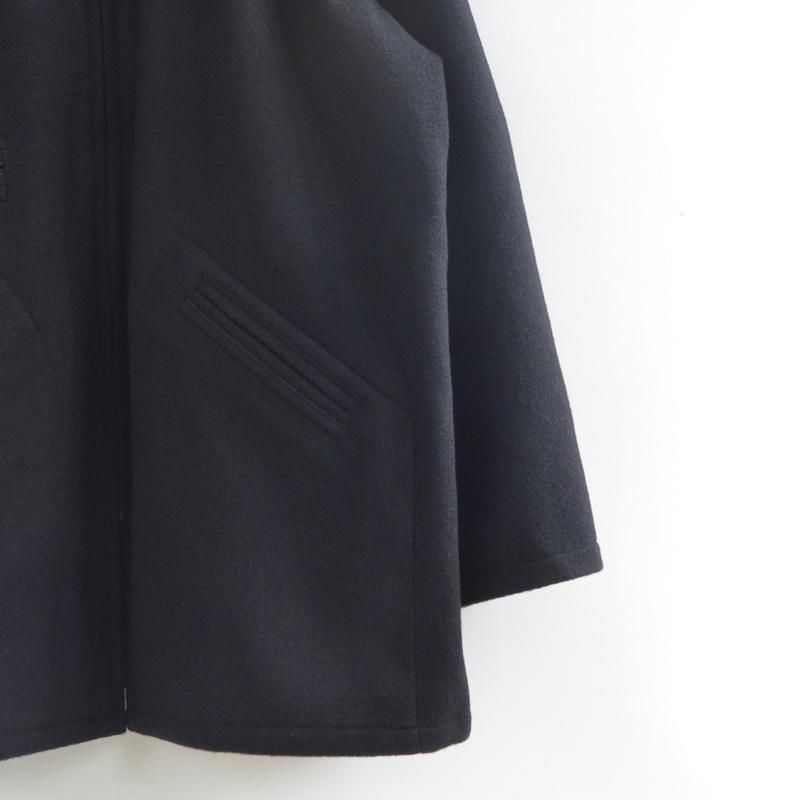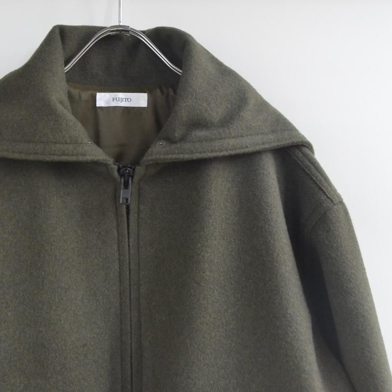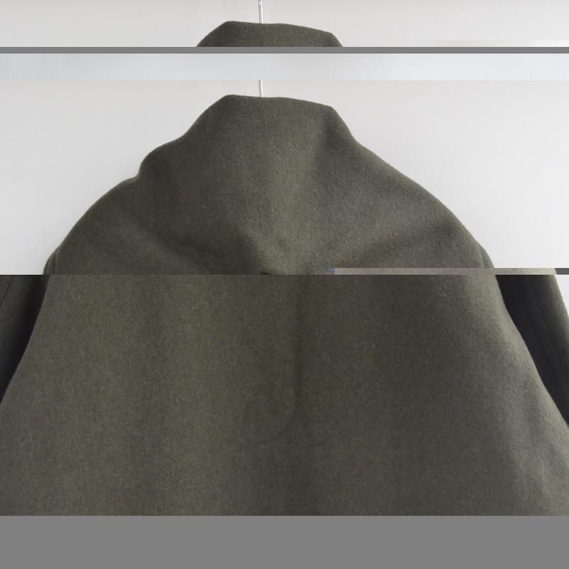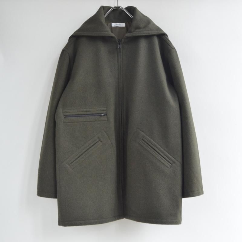 This item is made with a wool material that has a substantial look and feel, yet is very light when worn. It offers excellent heat retention due to a napped (brushed) finish achieved through a fulling process on just one side. A characteristic feature is the hood, which can also be adjusted into a collar specification, allowing you to enhance warmth around your neck depending on the coldness. The relaxed silhouette makes it easy to wear over thick inner layers, and it is practical with pockets on both front sides as well as a zip-type pocket.